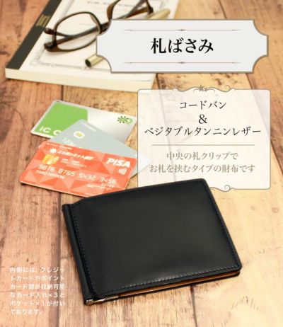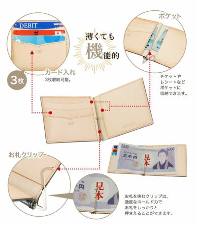中央の札クリップでお札を挟むタイプの財布です。内側には、クレジットカードやポイントカード類が収納可能なカード入れ×3とポケット×2が付いております。