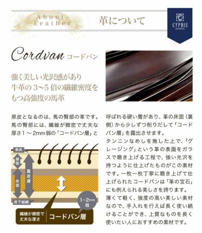その美しいツヤから「革の宝石」とも呼ばれる「コードバン」と、タンニンなめしで「革の中の革」とも言われる「ヌメ革」を使用したシリーズ。どちらも革好きに人気で、適切なレザーケアを施すことで長く使えて味わいが増すのが特徴です。