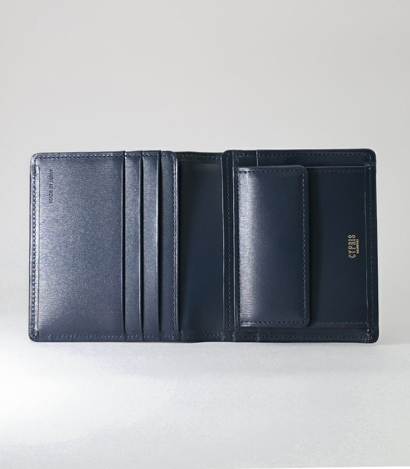スナップボタンタイプの小銭入れ、クレジットカードやポイントカード類が収納可能なカード入れ×4が付いております。ベロで両側からお札を挟み込む仕様で、コンパクトかつ薄くスマートな財布を実現しました。コーナー部分には、ヘラで丁寧にきざみを入れる技術を施しています。このデザインは美しく広がったきざみが、菊の花のように見えることから、”菊寄せ”と呼ばれております。