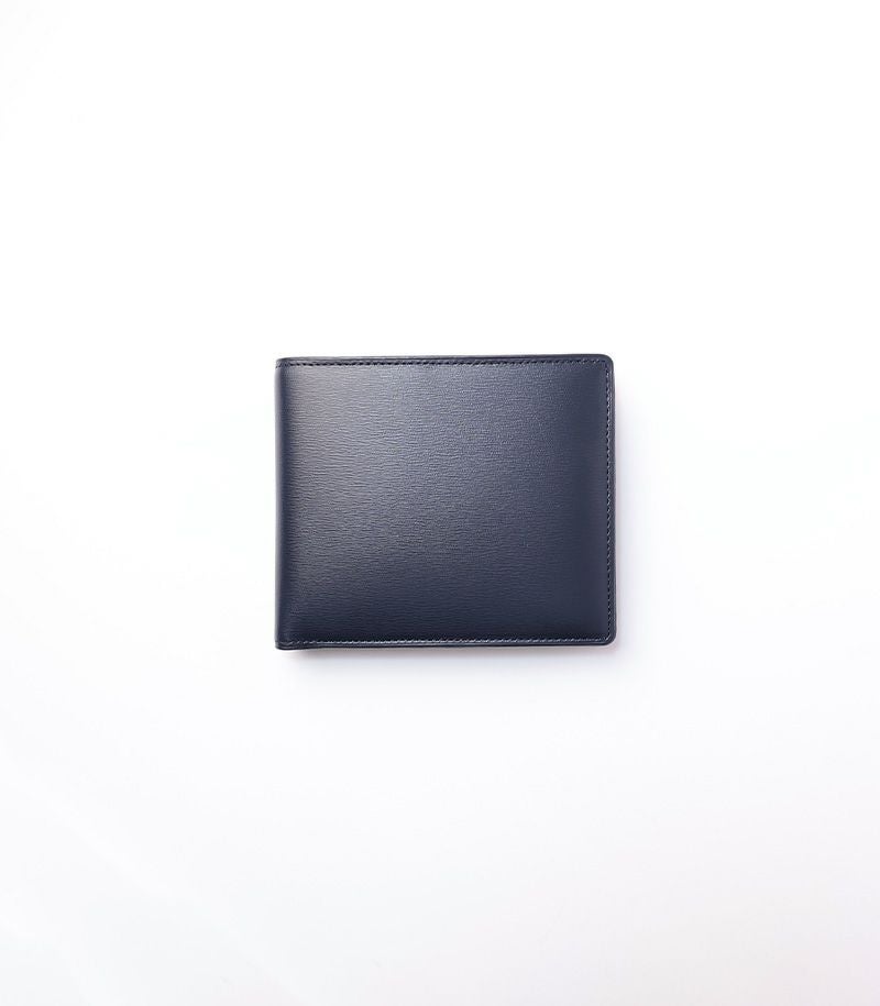 スナップボタンタイプの小銭入れが付いた二つ折りの財布です。内側には、クレジットカードや交通系ICカード類が収納可能なカード入れ×4とポケット×5が付いております。 コーナー部分には、ヘラで丁寧にきざみを入れる技術を施しています。このデザインは美しく広がったきざみが、菊の花のように見えることから、”菊寄せ”と呼ばれております。