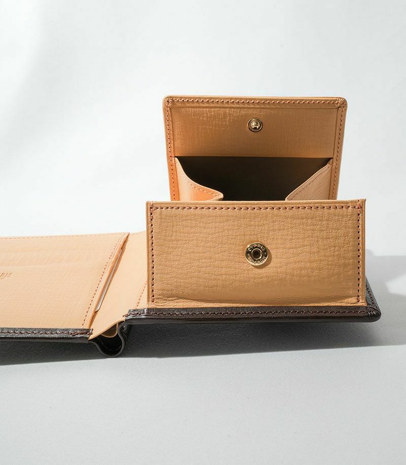 小銭入れは、大きく口が開くため、小銭が見やすく・取り出しやすいボックスタイプです。クレジットカードや交通系ICカード類が収納可能なカード入れ×4とポケット×3が付いた札入れです。