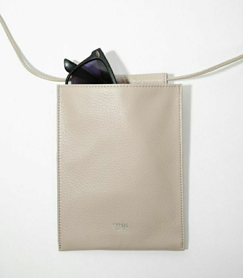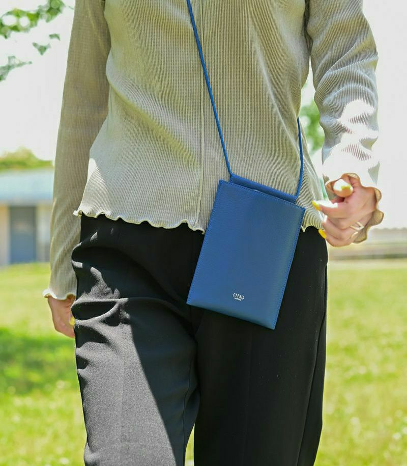 メイン収納には横105mm×縦160mmまでのサイズのスマートフォンが収納でき、スマホの他にもサングラスや眼鏡も入ります。裏側のポケットにはカード類が収納可能。