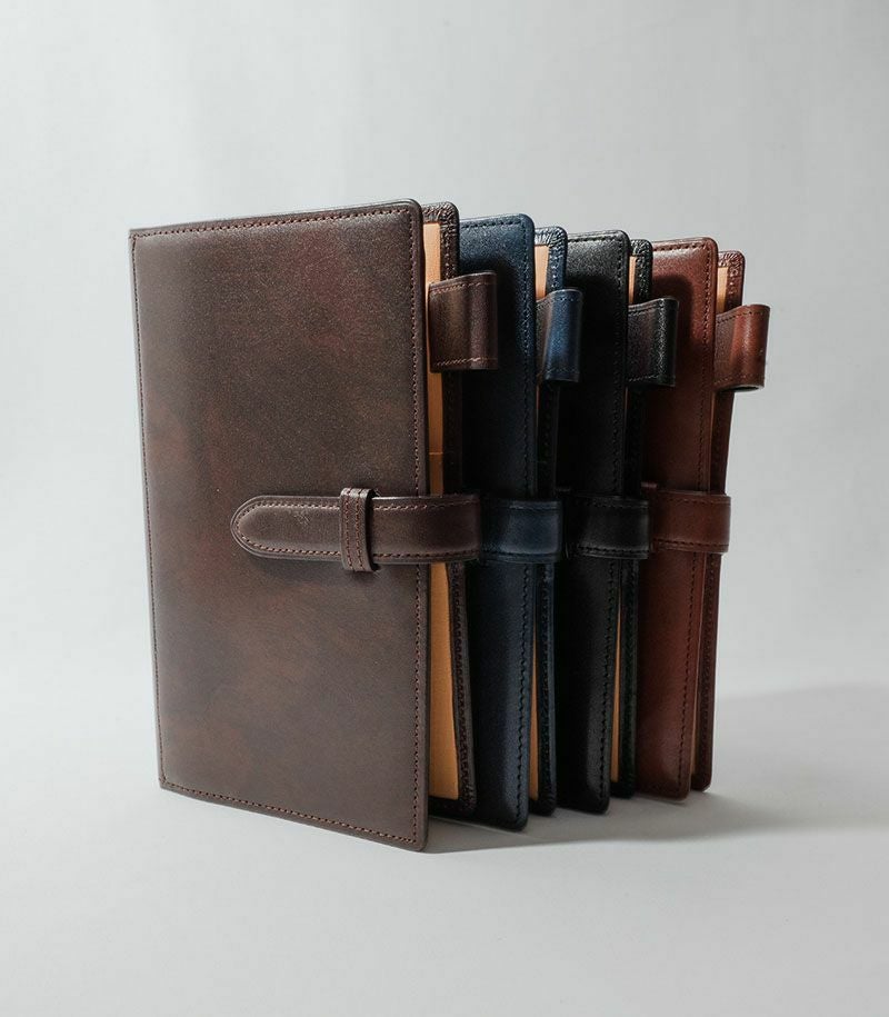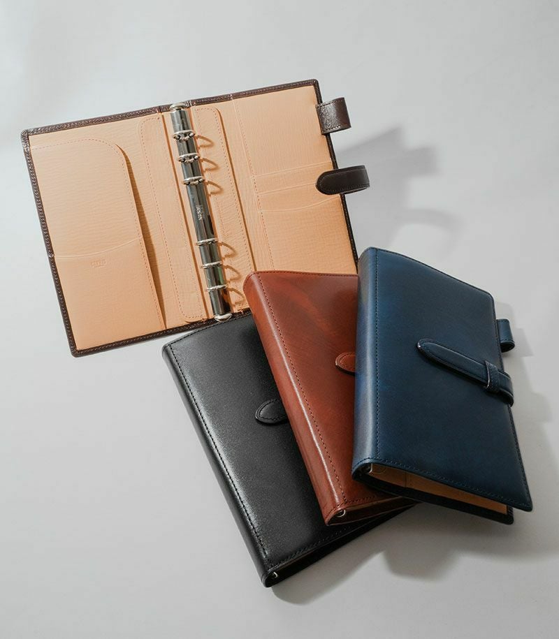 バイブルサイズの手帳です。内側には、カード入れ×4、ポケット×1、ホルダー×1、ペン差し×1が付いております。180度開くので、書きやすさにも優れた手帳です。