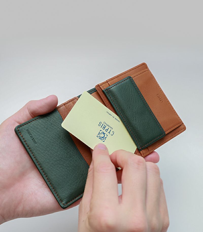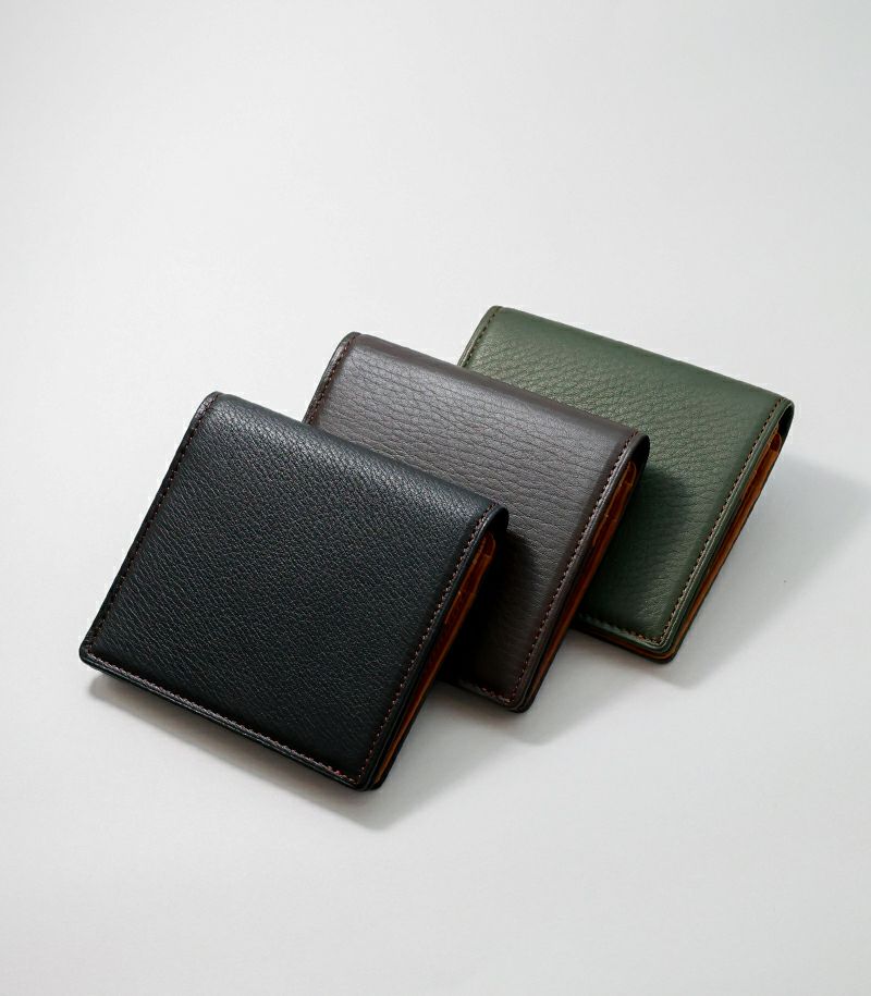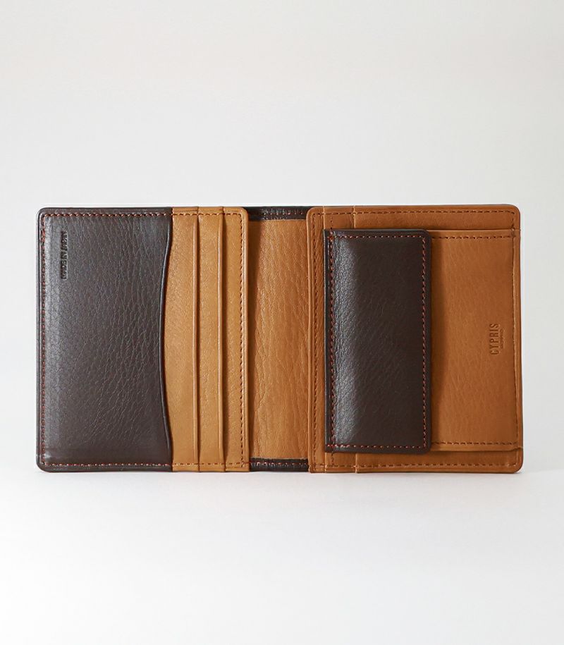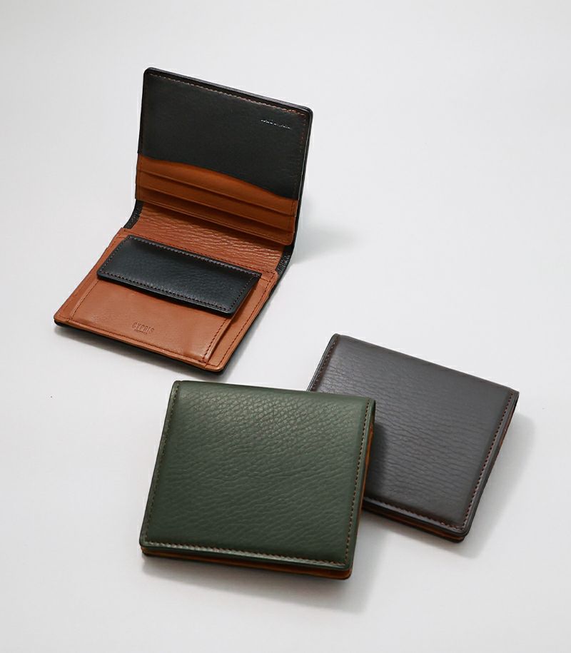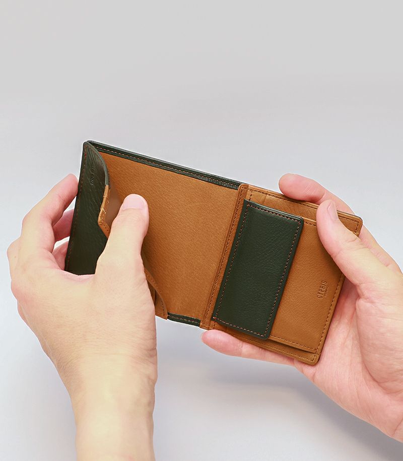 スナップボタンタイプの小銭入れ、クレジットカードやポイントカード類が収納可能なカード入れ×4が付いております。ベロで両側からお札を挟み込む仕様で、コンパクトかつ薄くスマートな財布を実現しました。