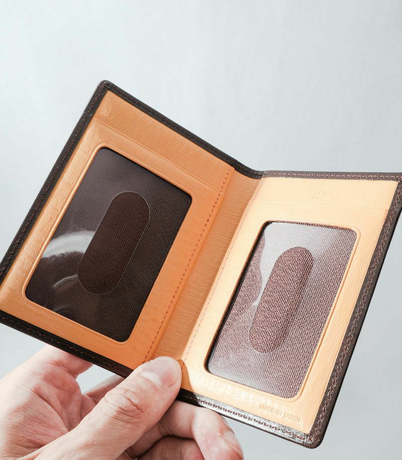 内側の2面に収納できる二つ折りのパスケースです。内側にはポケット×2が付いております。