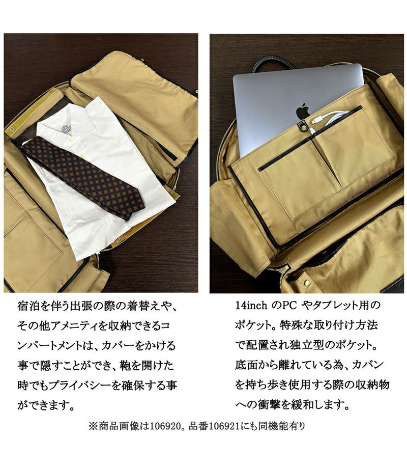内側には、オープンポケット×6、カード入れ×1、ペン差し×3、またドリンク・折りたたみ傘に使用できるホルダーが2つついています。外側にもオープンポケット×4が付いております。両サイドのマチを開ける事で鞄をフルオープンにすることが可能です。