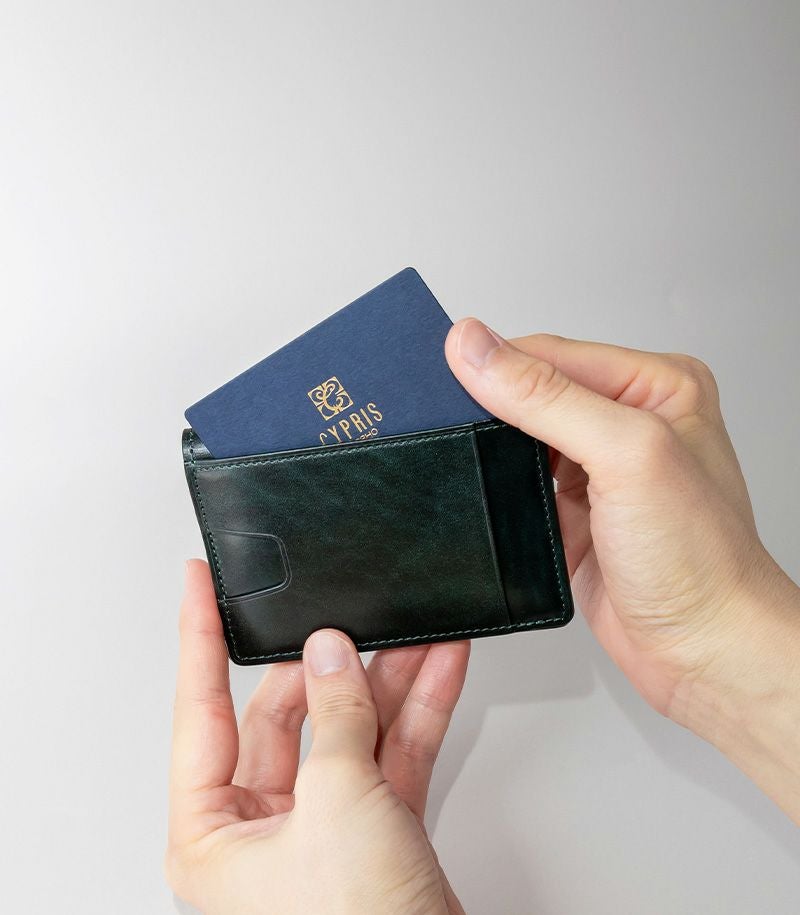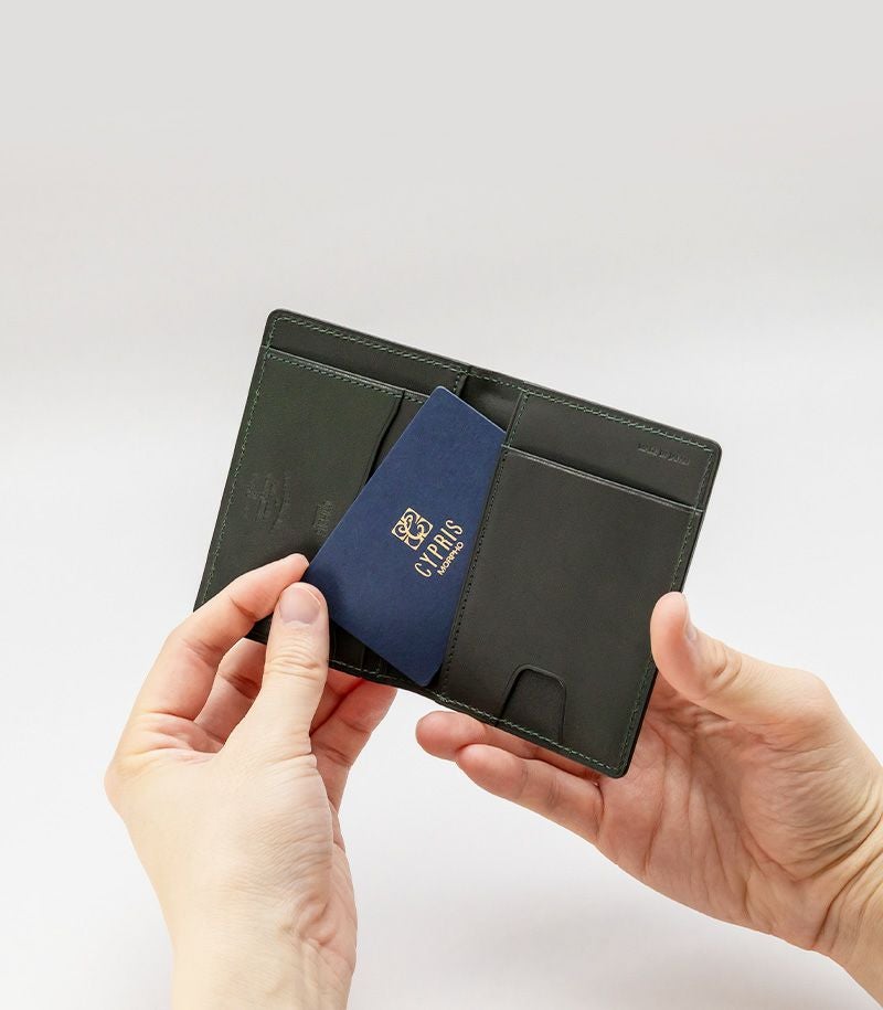 内側と表側の2面に入れることができる二つ折りのパスケースです。他にも、内側にはポケット×3とカード入れ×2、表側にはポケット×1が付いております。